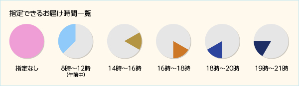 お届け日のほかにお届け時間の指定も可能です。お届け時間は以下の中からお選びいただけます。